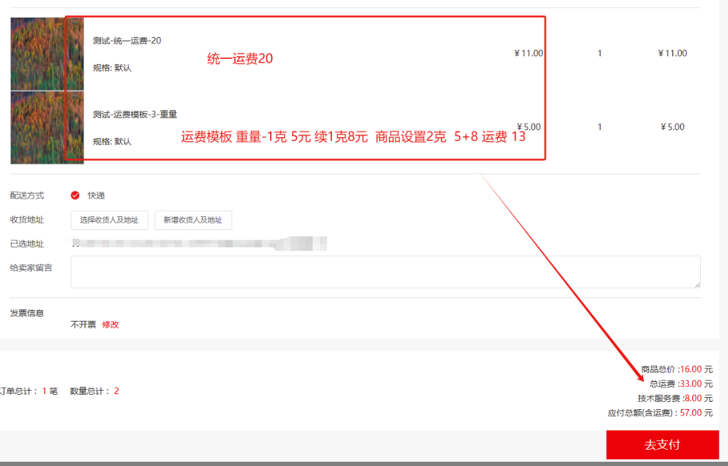 4)统一运费商品,和运费模板商品一同结算:单独计算统一运费商品应收运费,再累加运费模板应收运费;