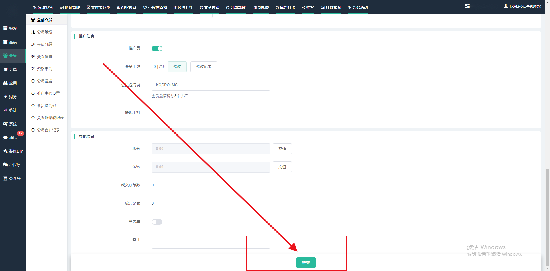 目录 搜索 展开 一、前期准备资料二、数字乡村码-上线操作指南1、服务号的申请流程及认证2、申请小程序流程3、开放平台绑定小程序和公众号三、数字乡村码-系统操作数字乡村码系统管理-概况数字乡村码-商品管理1、发布商品2、商品列表3、商品表单4、商品分类5、品牌管理6、配送模板7、评论管理8、优惠券管理9、商品标签10、退货地址设置11、满额优惠12、批量操作13、配送方式14、基础设置15、商品隐藏四、数字乡村码-会员管理1、全部会员2、会员等级3、会员分组4、资格申请5、会员设置6、推广中心设置7、会员邀请码8、会员关系链修改关系链修改记录9、会员合并记录10、账号注销管理11、会员设置中心五、数字乡村码-订单管理1、订单管理列表2、订单处理流程3、订单状态4、订单修改价格5、订单退款退货6、多包裹发货7、批量发货订单操作步骤8、催发货订单9、物流查询六、数字乡村码-财务管理1、余额设置2、会员余额3、充值记录4、转让记录5、余额明细6、收入明细7、提现设置8、提现统计9、积分管理10、转账审核11、收益广告12、批量充值七、数字乡村码-系统管理1、商城入口2、商城设置①、商城设置②、订单设置③、物流查询④、短信⑤、联系方式⑥、分类⑦、优惠券⑧、分享⑨、幻灯片⑩、广告位⑫、地图设置3、交易设置4、微信模板消息自定义消息模板(新版)自定义消息模板(旧版)小程序消息模板公众号模板消息变更公告5、语言设置6、权限管理7、多媒体管理八、数字乡村码-消息管理九、数字乡村码-应用管理十、数字乡村码系统-数据统计十一、数字乡村码-页面装修DIY1、模板管理2、店铺页面3、顶部导航4、底部导航5、DIY模板市场6、首屏广告7、基础设置8、装修DIY尺寸建议十二、供应商功能插件操作指南1、供应商2、门店-收银台门店申请和使用步骤门店管理①、门店-收银台 营销设置②、门店-收银台 分润设置门店分类门店申请门店审核门店商品门店商品订单收银台订单数据统计核销员基础设置默认设置门店装修3、微社区4、会务活动十三、营销插件操作指南活动报名提货卡新人奖微店问卷调查积分视频分享1、视频分享基础设置2、视频分享发现管理3、视频分享分类管理4、视频分享评论管理5、视频分享分红记录6、视频分享短视频中心每日红包幸运大抽奖签到优惠券二维码任务奖励优惠劵文章音频文章付费文章限时购新海报拓客卡操作流程积分活动素材中心视频红包十四、入驻门店应用类1、门店预约2、附近商品3、门店定位设置4、门店控制5、门店满额包邮6、门店满额减7、导入商品8、门店搜索9、门店股东10、核销券11、多门店核销1、商城后台设置2、前端功能演示十五、常见问题1、后台登录密码修改流程2、会员-余额,积分,后台如何进行充值与扣除3、如何修改上下级关系4、一种万能的获取商城小程序路径的方法 暂无相关搜索结果! 阅读次数:1725 本文档使用 模王系统 发布 3、如何修改上下级关系 如何修改上下级关系一.如何修改上下级关系?1.会员-全部会员-可以通过搜索用户的独立ID,或者用户微信昵称,找到此会员,然后点击右边的(操作)2.再点击会员详情。3.滑到下面,有个推广信息-会员上线,点击修改4.输入上级的ID号,点击搜索,出来此上级会员后点击选择。5.滑到最下面,一定要点击提交按钮。文档更新时间: 2024-01-05 14:50 作者:链上旅行